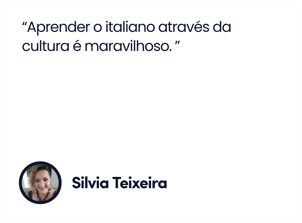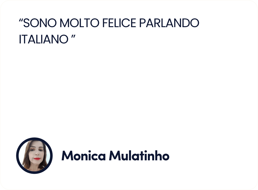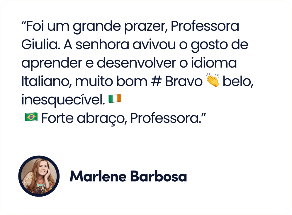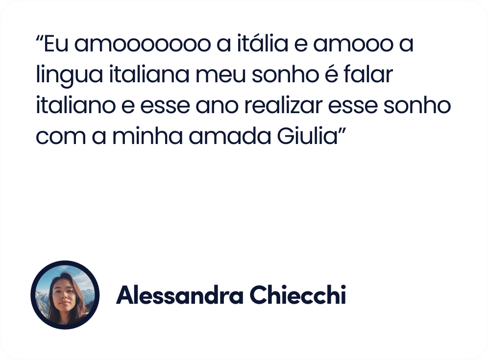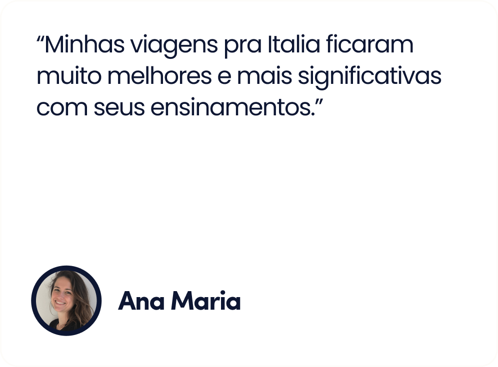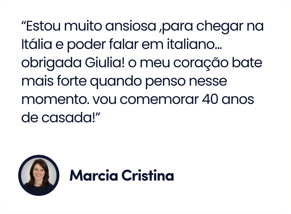 Até o momento, mais de 100 mil brasileiras, de todas as idades, que iniciaram a sua jornada no italiano, e aprenderam a falar italiano com confiança, usando o meu método que une cultura e comunicação real para criar uma imersão completa no idioma.